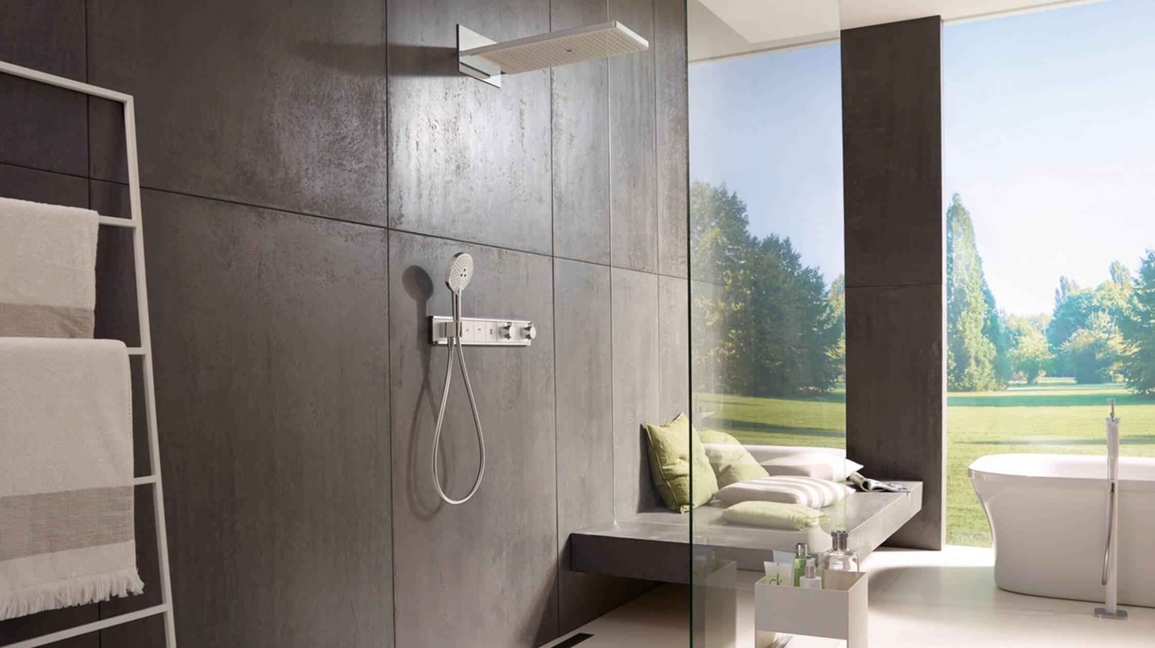 ハンスグローエにおいて優れたバスルームデザインと技術的完成度および操作の快適性は、分かちがたく結びついています。プラビダシリーズの水栓なら、流れるようなフォルムとクロム&ホワイトの有機的なコンビネーションで、カスタマイズ型のバスルームにアクセントを加えます。また、フォルムとテクスチャーの繊細な相互作用がバスルームのセラミックと調和しており、明るい色調の大きな石のタイル、コンクリート打ちっぱなしや純白の石膏を使った天井が、全体の雰囲気を引き立てています。中央に置かれたのが、レインメーカー セレクトのシャワーパイプ。白&クロム仕上げで明るい印象を与えるだけではなく、シャワーを存分に楽しめる機能も申し分ありません。