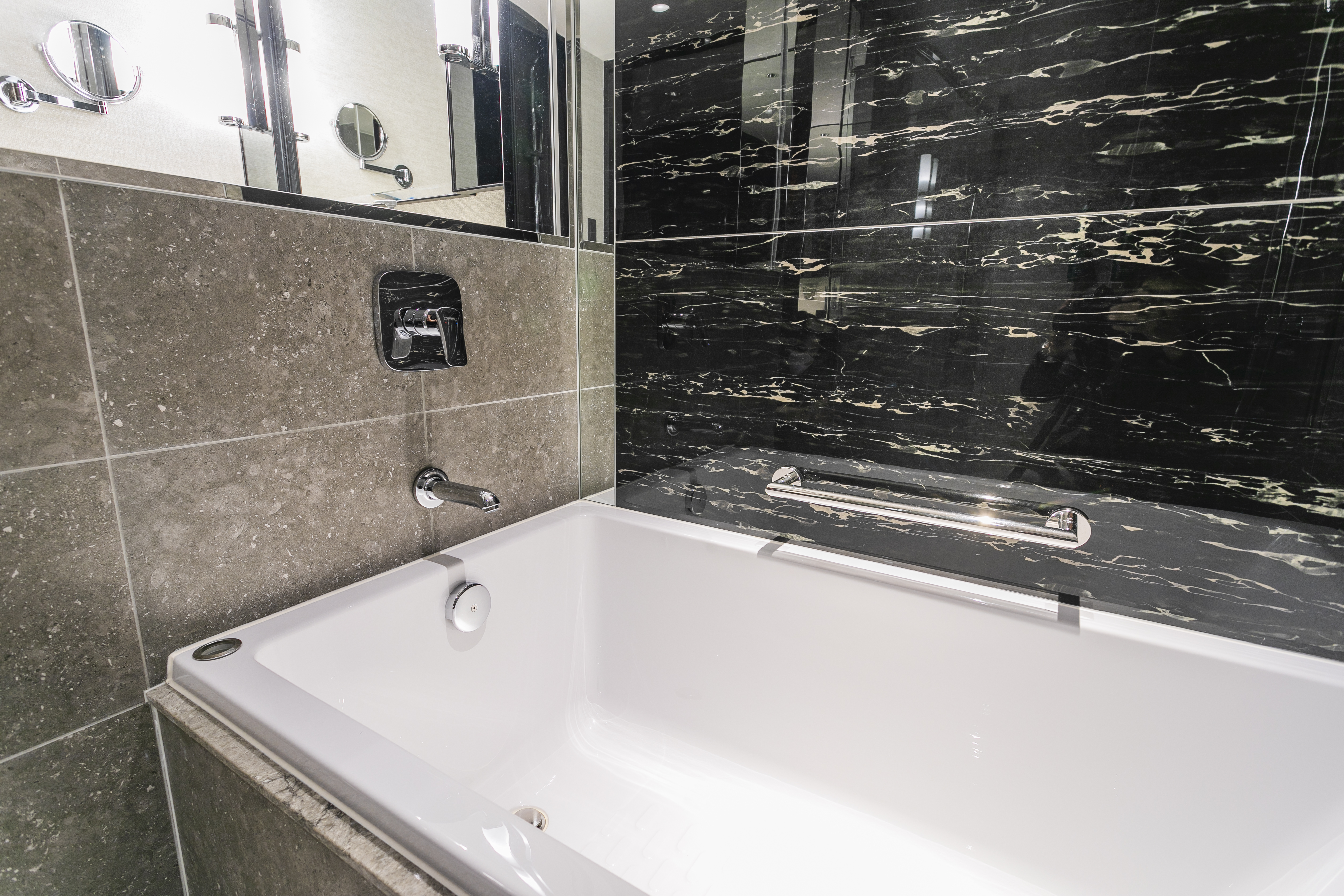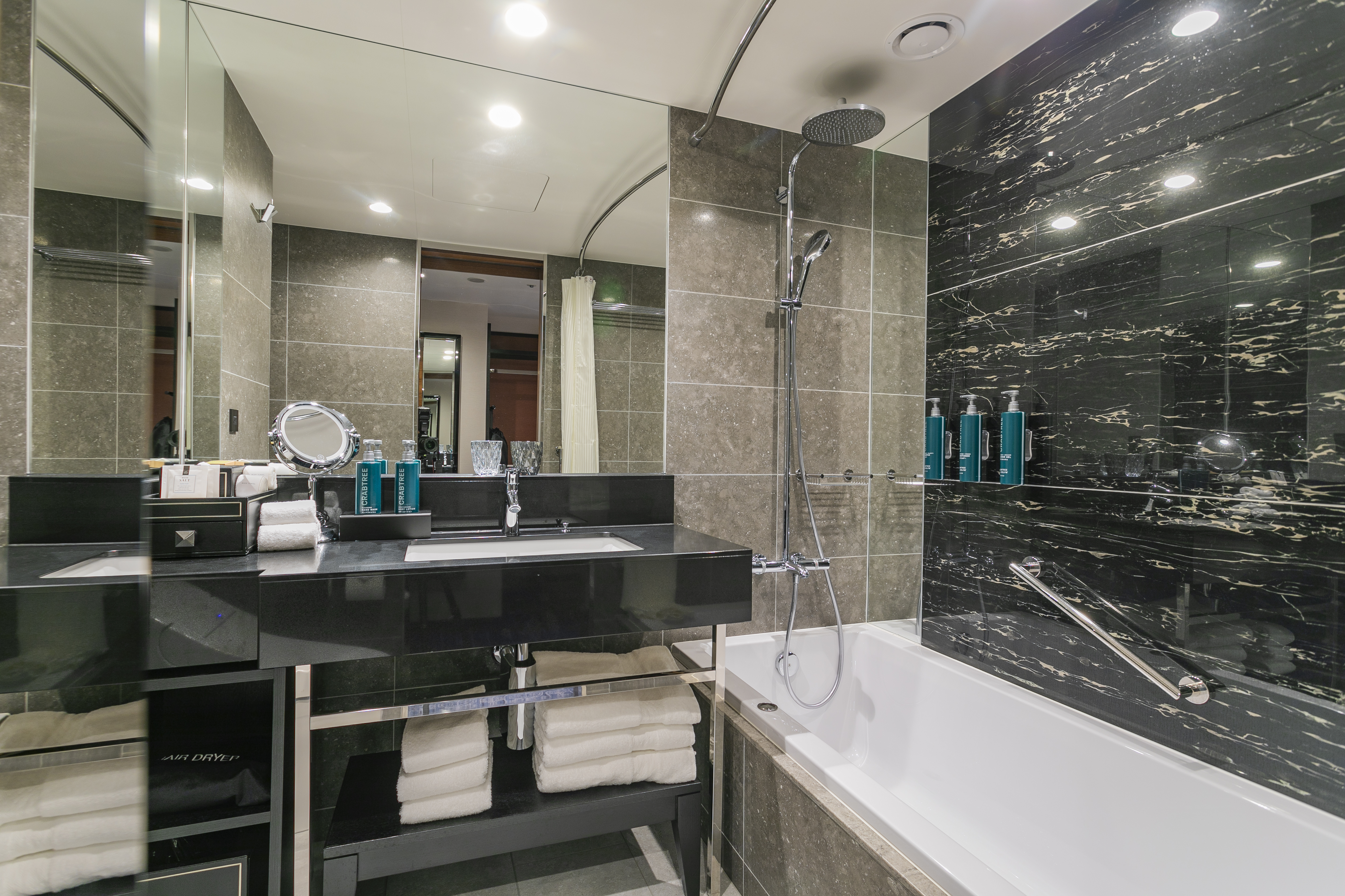 また、バスルームのインテリアはモノトーンカラーを基調にまとめられており、シックで落ち着く空間となっています。