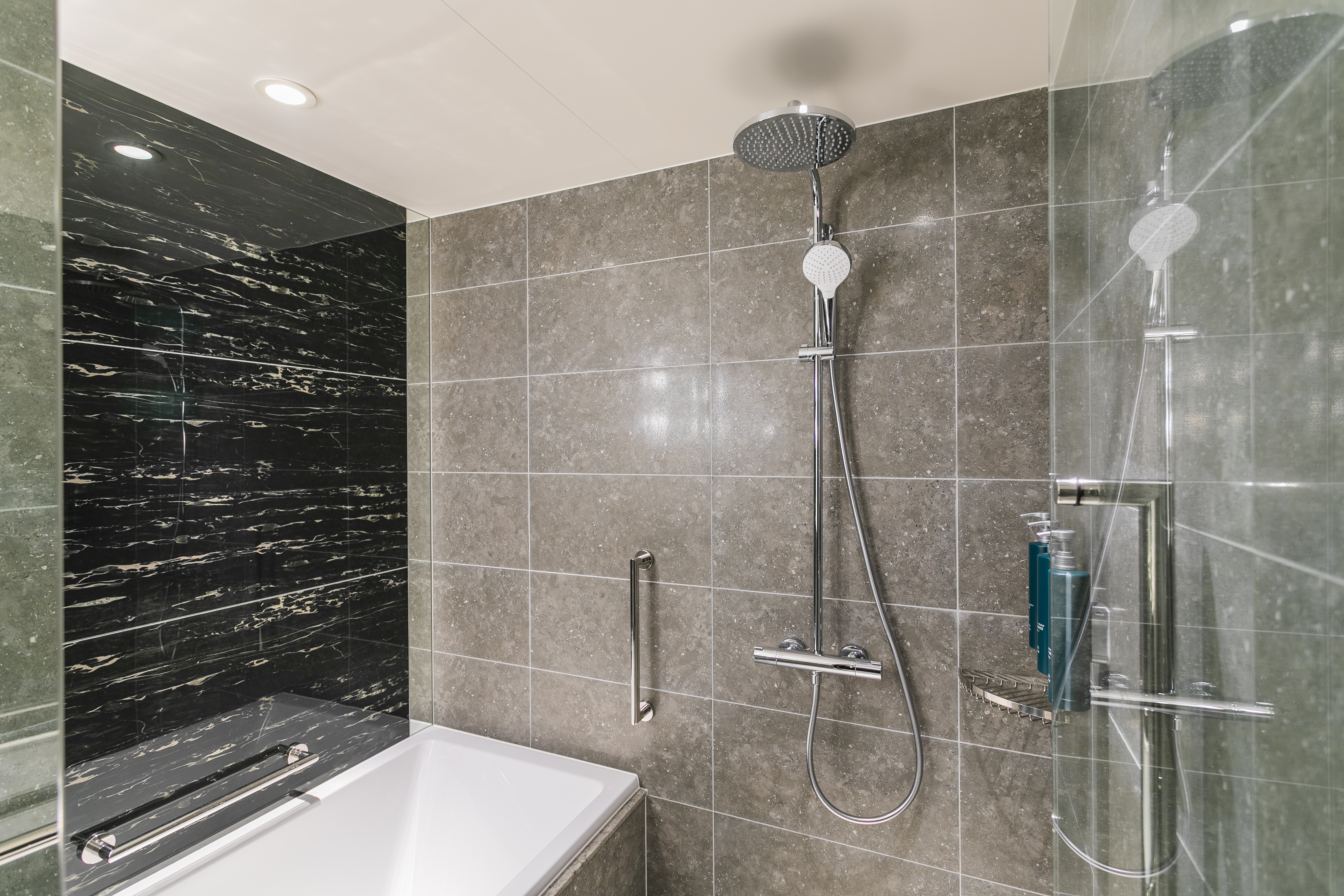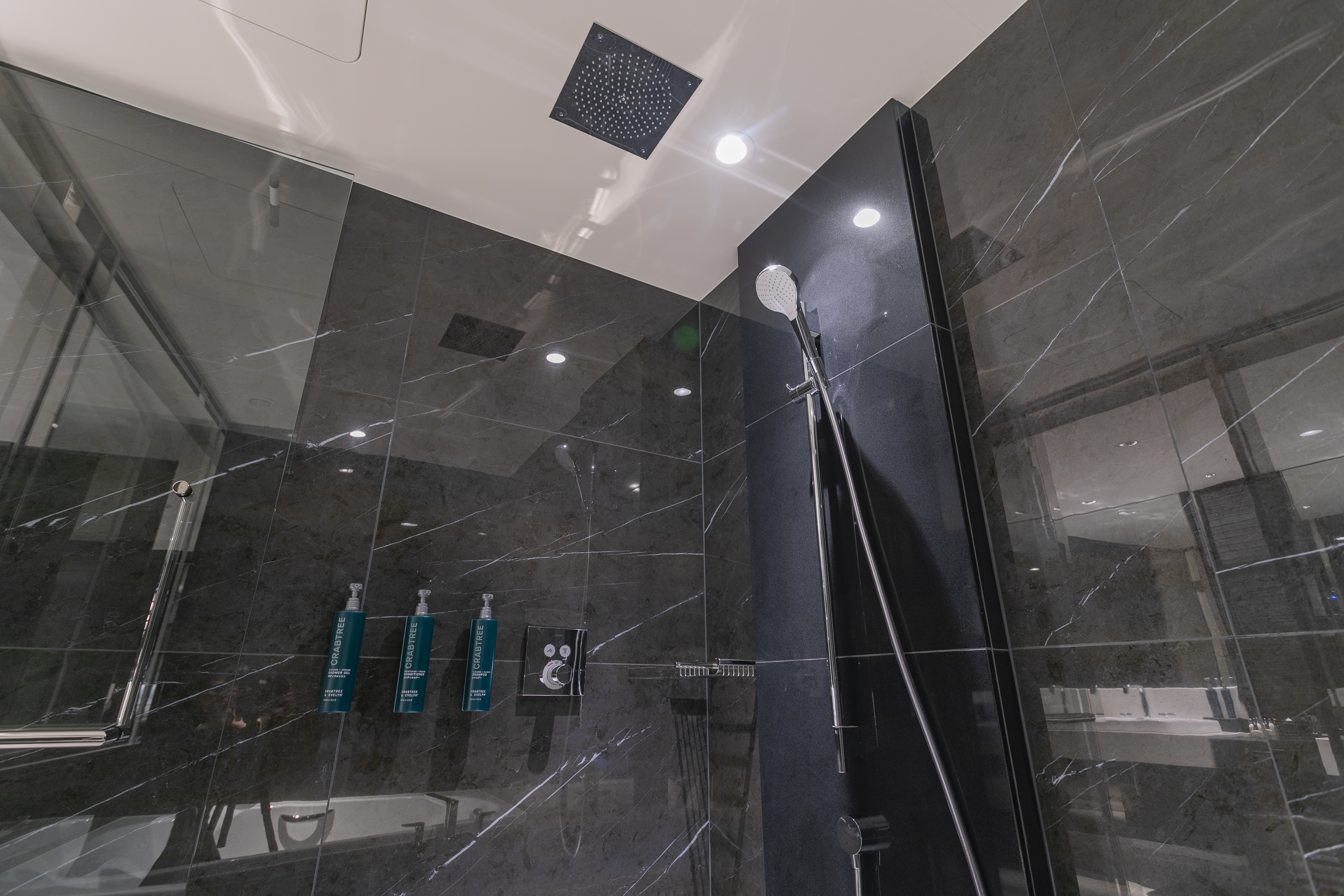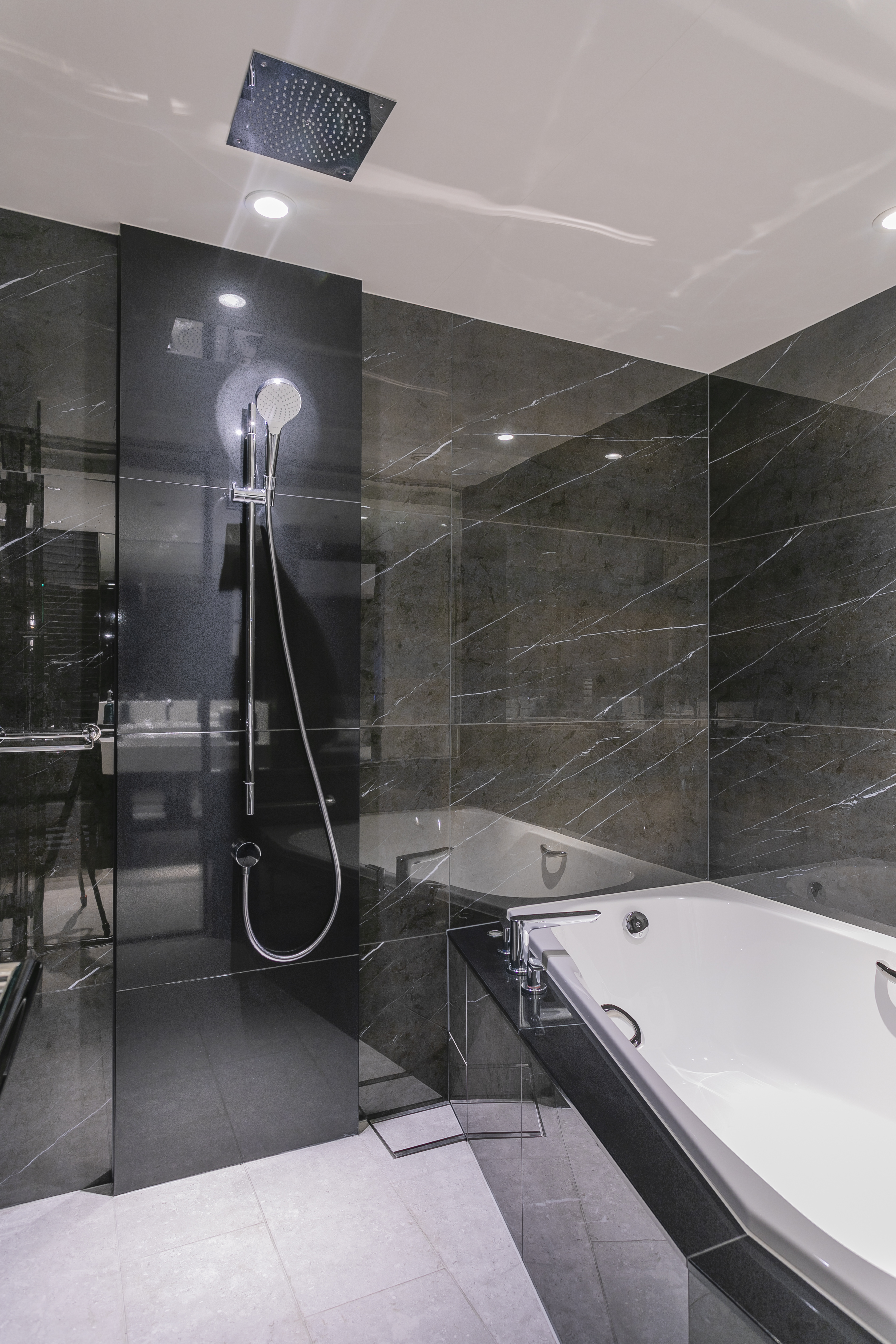 たっぷりとしたシャワーで身体を洗い流し、広々としたバスタブでゆったりと寛げるホリスティックなバスルームです。