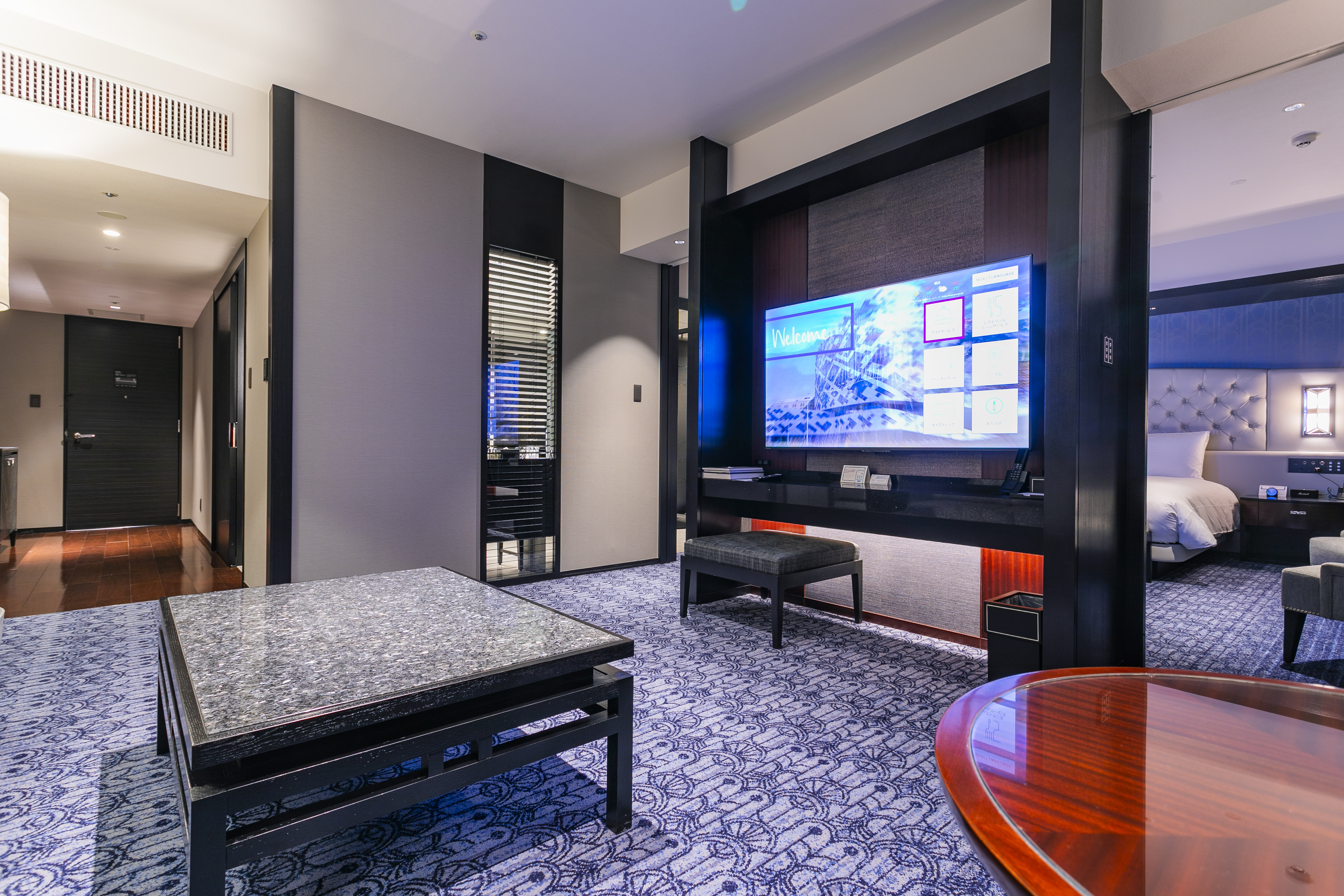 アールデコ調の幾何学模様が印象的な客室内。
